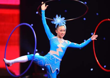 Jin Linlin, hula hoop Guinness World Records keeper, perform at the closing ceremony of the 2008 Beijing Dahongmen International Clothing Festival, in Beijing, capital of China, on October 20, 2008. [Xinhua]
