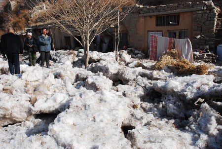 Local residents stand in front of their houses after a sudden ice jam on the Yellow River flooded the area Sunday morning, January 18, 2009. So far no casualties have been reported. [CFP]