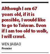 "Taiwan is the treasure island of China, and is a place I always look forward to visiting. Although I am 67 years old, if it is possible, I would like to go to Taiwan. Even if I am too old to walk, I will crawl," an emotional Wen said while answering questions raised by a Taiwan-based Central News Agency journalist. "I want to visit the Ali Mountain, the Sun Moon Lake, walk around the island, and get to know the Taiwan compatriots," Wen said.
