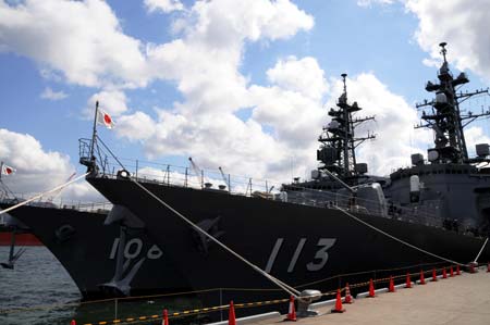 The two Japanese Maritime Self-Defense Force (MSDF) destroyers heading to Somalia get ready to leave their base in Kure, Hiroshima prefecture, Japan, on March 14, 2009. [Agencies]