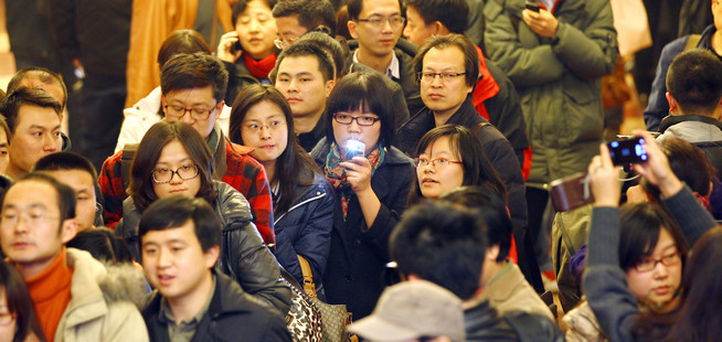 Reporters line up and wait to receive their press cards for the upcoming two sessions at the hall of the Chinese People's Political Consultative Conference in Beijing on March 1, 2012.
