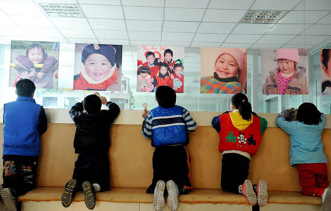 Five orphans look at their photos taken a fewer years ago at their residence – Fuyang AIDS Orphan Salvation Association – in Fuyang city, East China's Anhui province, Nov 27, 2013. [Photo/Xinhua] |
