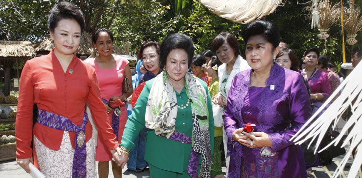 Peng Liyuan of China, wife of Chinese President Xi Jinping, holds hands with Rosmah Mansor of Malaysia, wife of Prime Minister Najib Razak, and Ani Yudhoyono, the Indonesian president’s wife, during their visit to the Bali Safari and Marine Park in Gianyar, on the Indonesian resort island of Bali on Monday.