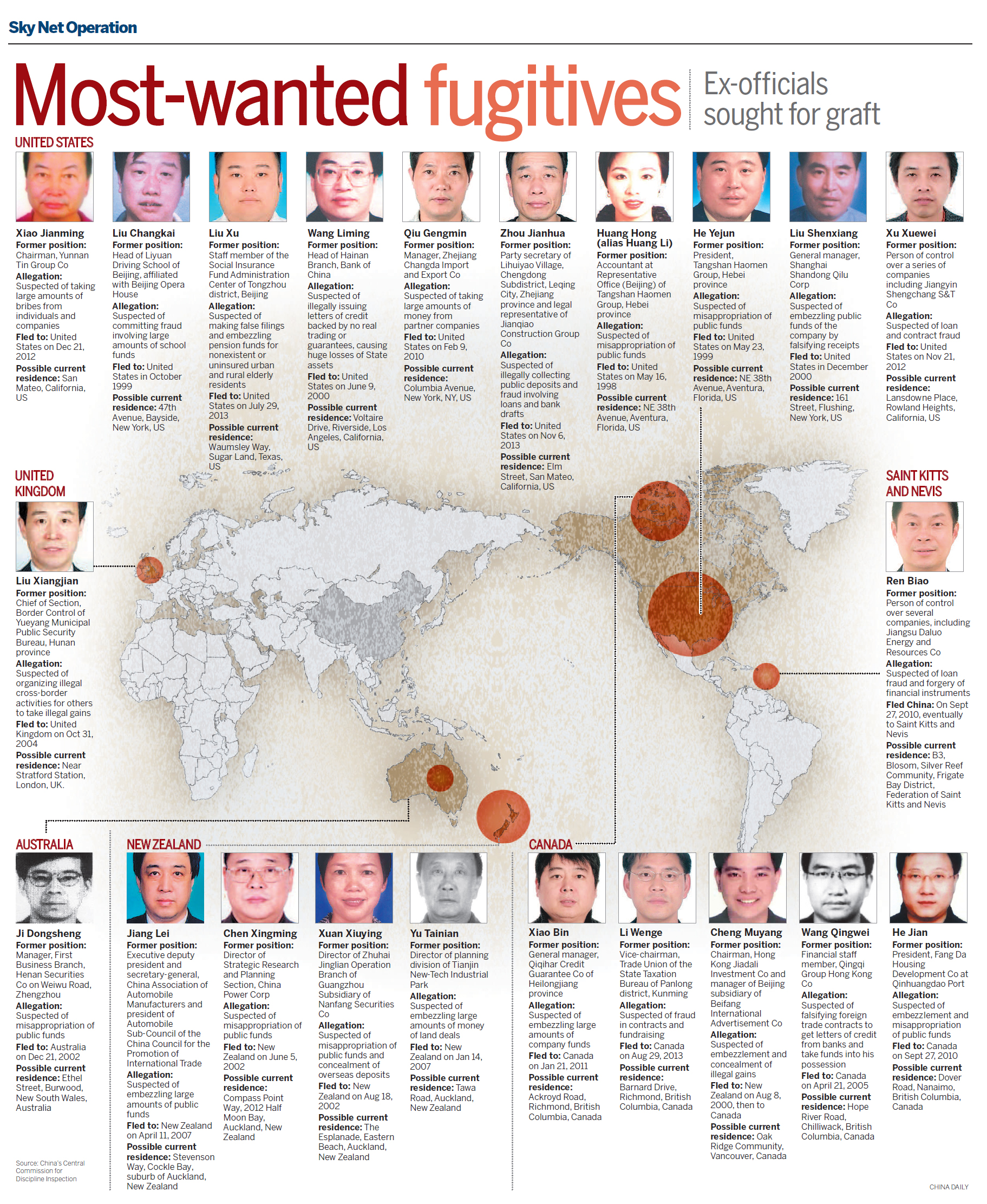 On Thursday, the CCDI also made public detailed information about 22 high-profile Chinese fugitives, 15 of whom are in the US and Canada. The information included suspects' photos, ID numbers, passport numbers, suspected crimes, the date they fled China and their suspected current location.