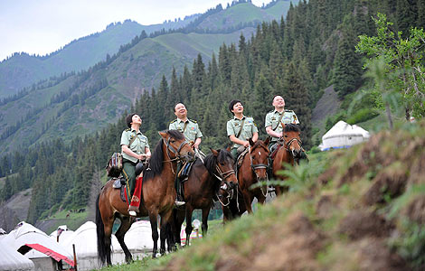 Staff members in Red Army uniforms visit Jinggang Mountain in East China's Jiangxi province on Sept 20, 2012.