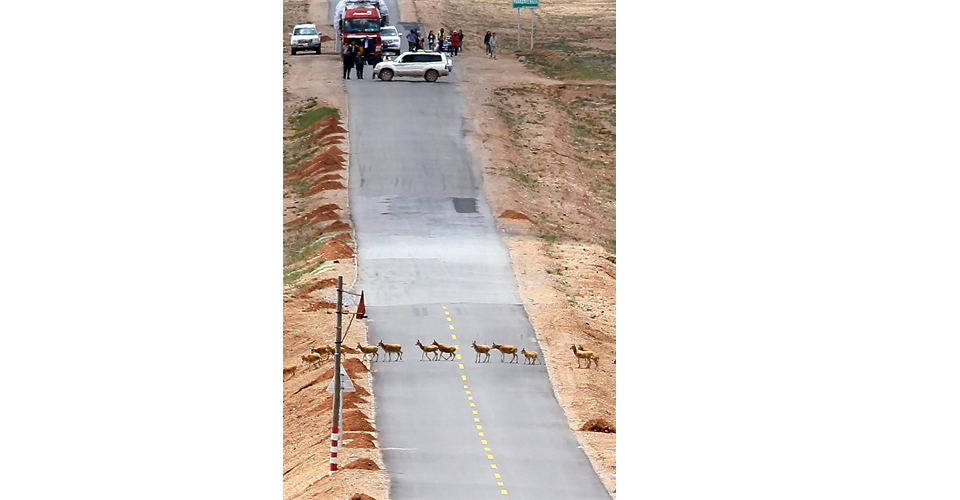 Volunteers stop traffic on the Qinghai-Tibet Highway to allow antelopes safely cross the road, July 27, 2011. [Photo by Zou Hong/China Daily]