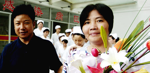 A two-year-old baby girl surnamed Peng (L) prepares to leave hospital after recovering from bird flu at the Taiyuan No. 4 Hospital, Feb. 3, 2009.