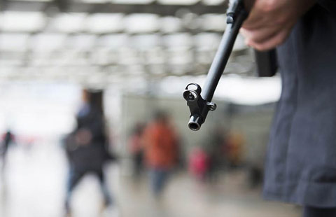 Armed policemen patrol a public square outside the Kunming Railway Station where a deadly terrorist attack on Saturday night left 29 dead and more than 130 injured, March 3, 2014.