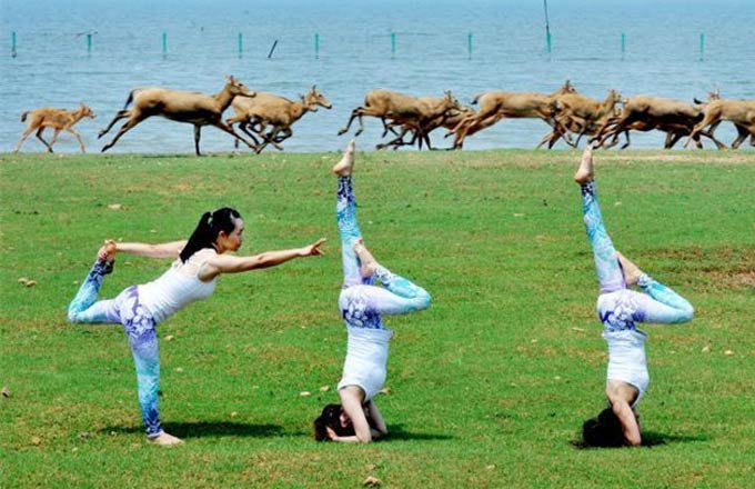 Yoga lovers stretch next to Poyang Lake