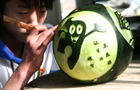 A student carve Expo mascot 'Haibao' on a watermelon at Jinan No. 3 Vocational School in Jinan, Shandong province,March 11, 2010.[Photo/CFP]