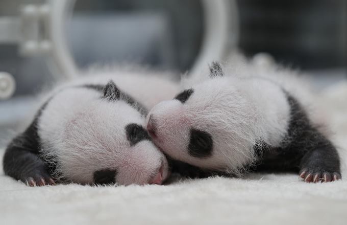 Captive panda twins meet visitors