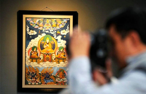 More than 50 works of Tibetan Thangka painting created by master Norbu and his students are on display at an exhibition in Lhasa, capital of Southwest China's Tibet autonomous region, May 3, 2016. Thangka, a Tibetan scroll-banner depicting various kinds of contents, is known as a Tibetan "encyclopedia". [Photo/Chinanews.com]