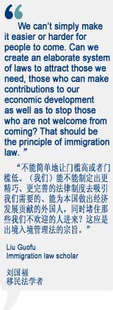 The law is to help a country adjust its policies to best follow the rules. If people want to come to China, we can't simply reject them. We can't go against the pattern of international migration. For those who should be welcomed, we should offer them more opportunities, but for those who shouldn't, we must strictly control their arrival.