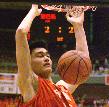 | | China's tallest player Yao Ming, who stands at 2.23 metres, slam dunks the ball during their match against Lebanon at the 21st Asian Basketball Championship for Men finals in Shanghai, July 28, 2001. China won 97-63. Yao Ming received the most valuable player award for the tournament. [Reuters]