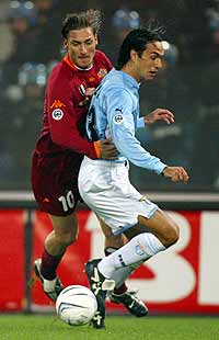 Roma's captain Francesco Totti (L) challenges Lazio's captain Alessandro Nesta during their Serie A soccer match in Rome's Olympic stadium March 10, 2002. [Reuters]