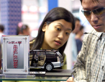 A new car design, to be put into production by the Taiwan-invested Southeast Auto Co next year, draws visitors' attention at the 2003 Cross-Straits Scientific and Technological Achievements Fair & Conferences on Economy and Trade in Fuzhou on Sunday. [newsphoto.com.cn]