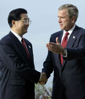 Chinese President Hu Jintao (L) shakes hands with US President George W. Bush at the start of their bilateral meeting at the Royal Parc Evian resort in the French Alps June 1, 2003. The two leaders met on the sidelines of the informal South-North leaders dialogue meeting held here Sunday ahead of the annual summit of the Group of Eight (G8) leading industrialized countries. [Reuters]
