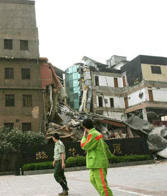 Two police officers pass the wreckage of a collapsed six-storey office building on the construction site of a metro line in Shanghai on July 1, 2003.  [newsphoto.com.cn]