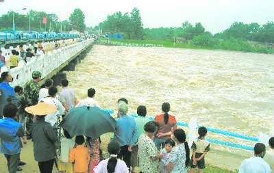 The Huaihong diversion river, which links the city of Huaiyuan and Hongzehu Lake on the river's lower reaches, can handle a maximum flow of 2,000 cubic metres per second. Water was flowing at 7,000 cubic metres per second in the Huaihe River at Huaiyuan yesterday.
