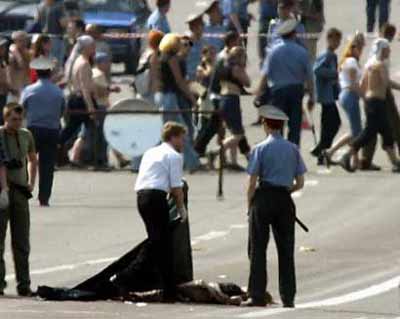 A Russian policeman covers a body after an explosion at rock concert at Tushino airfield, outside Moscow on July 5, 2003. [Reuters]