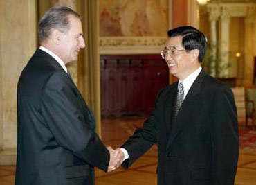 Chinese President Hu Jintao (right) meets with IOC President Jacques Rogge, pledging more efforts to strengthen public health, emergency response and security systems in China ahead of the 2008 Olympic Games in Beijing. [newsphoto.com.cn]