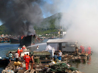 Onlookers watch firemen trying to put out fierce fire which broke out in two big fishing boats anchored for repair and maintenance in Sanya, a port in southern China's Hainan Province. The fire was the result of an electrical fault and lasted for more than one hour, causing damage of at least 3 million yuan (US$360,000). [newsphoto.com.cn]