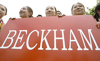 | | |  | | | Young Chinese women hold a sign reading "Beckham, I love you" as they wait for Real Madrid players outside a training centre in Kunming, the capital of China's southwestern province of Yunnan, July 25, 2003. Real Madrid, with newly added icon David Beckham, will arrive on July 25 to launch their two-week Asian roadshow as part of a bid to challenge the English Premier League's regional dominance on jerseys, billboards and televisions. [Reuters] | | | | | | | | | |