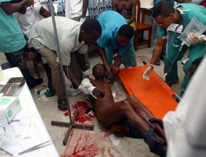 A wounded Liberian man is given help at the MSF clinic in