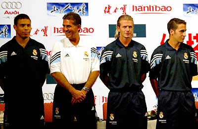 Real Madrid coach Carlos Queiroz (second from left) and Ronaldo, Beckham, and Raul attents a press conference in Beijing August 1, 2003. [newsphoto.com.cn]