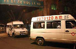 Ambulances wait at the entrance of a coal mine Aug. 14, 2003, where a gas explosion occurred earlier in the day in Yangquan, north China's Shanxi Province. The blast killed at least 26 miners. [Xinhua]