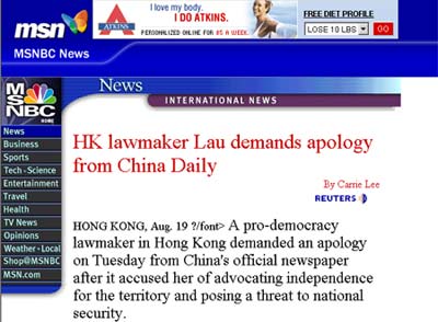 Using defence as a means of offence, Emily Lau Wai-hing held a press conference on Tuesday in which she not only refused to admit that her participation in a seminar organized by Taiwan independence advocates smacked of encouraging Taiwan separatism, but even accused the author of an article in China Daily of "sheer fabrication, hurling indiscriminate accusations, and making a mountain out of a molehill". She demanded an apology.