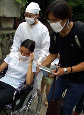 staff accompany a SARS "patient" to a quarantined area in a anti-SARS
