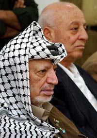 Palestinian President Yasser Arafat (L) and Prime Minister-designate Ahmed Qurie attend a meeting in the West Bank city of Ramallah, Sept. 22, 2003. Arafat declared a commitment to reaching a total cease-fire with Israel in a letter given to envoys of the peacemaking 'Quartet,' Palestinian officials said.   [Reuters]