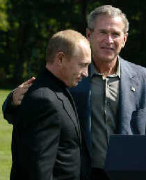 George W. Bush pats his Russian counterpart Vladimir Putin on the back