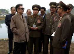 DPRK leader Kim Jong-il (2nd L), seen in this undated photo released by Korea Central News Agency Oct. 21, 2003, speaks to generals during an inspection tour of a farm controlled by a Korean People's Army unit somewhere in DPRK. [Reuters]