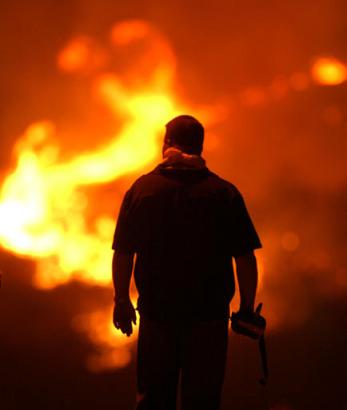 A 90,000-acre wildfire that straddles the Los Angeles-Ventura county line began moving slowly toward million-dollar mansions in a gated community in Los Angeles. California Department of Forestry Battalion Chief Thomas Foley said that in a "worst-case scenario," the blaze could spread all the way to the Pacific Ocean.