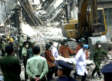 Rescuer search for survivors after a fire leveled an eight-storey building in Hengyang, Central China's Hunan Province November 3, 2003. The blaze claimed the lives of nine firefighters and 11 are still missing. [newsphoto.com.cn]
