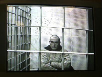In this image taken from television, Russian oil tycoon Mikhail Khodorkovsky participates by video link from behind the bars of a cell in the Matrosskaya Tishina jail on Nov. 11, 2003 during a closed session in a Moscow court from TV screen.  [AP]