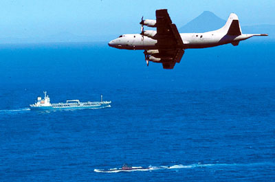 A Japanese marine Self-Defense Forces' P-3C anti-submarine patrol airplane (top) tails after the Chinsee submarine, November 12, 2003. [newsphoto.com.cn]
