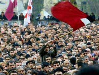 | | Opposition supporters rallying in front of the Georgian Parliament in Tbilisi, Sunday, Nov. 23, 2003. Georgia's opposition called on its supporters Sunday to press forward the 'velvet revolution' by seizing state television and the police headquarters, while a growing number of security forces and other officials loyal to Shevardnadze defected to the opposition. Protest leader Mikhail Saakashvili gave Shevardnadze a half-hour to resign, threatening that the opposition would march on his residence on the outskirts of Tbilisi if he doesn't go. [AP] |