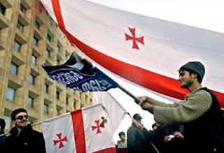 Opposition supporters wave old Georgian flags in front of the Georgian President Eduard Shevardnadze's office in Tbilisi, Sunday, Nov. 23, 2003. [AP]