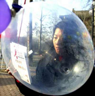 A Chinese student reads leaflet on AIDS behind a blown up condom during an AIDS awareness event at Tsinghua University in Beijing November 29, 2003. China is running its first officially backed condom commercials on TV to try to slow the spread of AIDS. [Reuters]