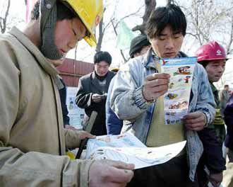 Migrant construction workers read leaflets with information about AIDS  prevention, after they were handed out by officials from the Beijing Center for Disease Control at a construction site in Beijing on World AIDS Day Monday Dec. 1, 2003. [AP Photo]