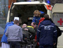 Emergency workers and paramdeics put an injured man into an ambulance outside the National Hotel in central Moscow, December 9, 2003. [AP Photo]
