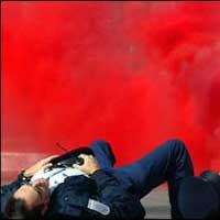 An Israeli policeman lies on the ground as he stimulate wounded people from a chemical attack during a drill held at the Ben Gurion International airport close to Tel Aviv.  [AFP]