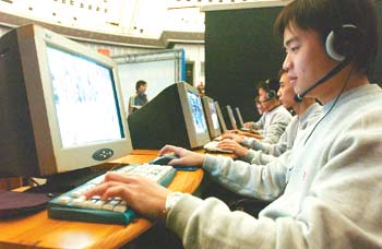 Participants compete during a CS (counter-strike) competition held in Henan Province in Central China over the weekend. However, the fast growing online gaming industry across the country is crippled by illegal game servers. [newsphoto.com.cn]