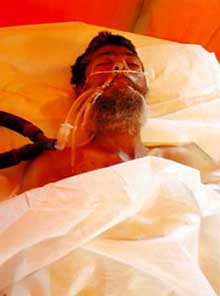 The man lay on a hospital bed covered by a white blanket and had an oxygen mask over his mouth and nose. He looked very thin and had a white-and-black beard.