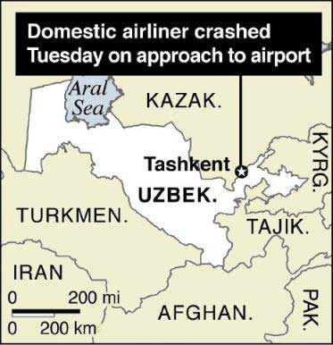 36 said killed in Uzbekistan plane crash ( 2004-01-14 09:43) (Agencies) A domestic airliner crashed Tuesday on approach to the airport in Uzbekistan's capital, the Interior Ministry said. At least 36 people, including the top U.N. official for Uzbekistan, were aboard and no survivors were reported.