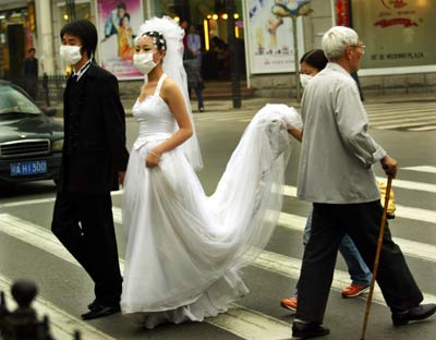 | | | | | | | | | | | | |  | | | Members of the women's drum group of the cultural centre in northeast Beijing's Chaoyang District rehearse in high spirits June 11, 2003, despite the drizzle after having stopped for more than one month due to the SARS outbreak. Cultural and entertainment activities have been resuming now that the worst is over for the virus-hit city. [newsphoto.com.cn] | | | | | | | | | | | | |  | | | A woman shops in an almost empty supermarket on April 24, 2003 as Beijingers went on a shopping spree after the SARS outbreak. [newsphoto.com.cn] | | | | | | | | | | | | |  | | | A masked woman walks on the Tian'anmen Square in Beijing on May 1, 2003. The outbreak of severe acute respiratory syndrome forced most Beijingers to wear masks when going out. [newsphoto.com.cn] | | | | | | | | | | | | |  | | | A masked newly-wedded couple walks on a street in Wuhan, central China's Hubei Province on May 6, 2003. [newsphoto.com.cn] | | | | | | | | | | | | |  | | | Medical workers carry out emergency treatment on a suspected SARS patient on April 29, 2003 in Wuhan, Central China's Hubei Province. [newsphoto.com.cn]