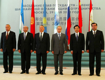 Leaders of the Shanghai Co-operation Organization (SCO) take a pause for a photo call at the SCO summit in Moscow Thursday. From left to right, they are Uzbekistan President Islam Karimov, Kyrgyz